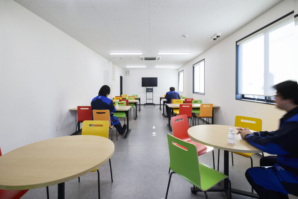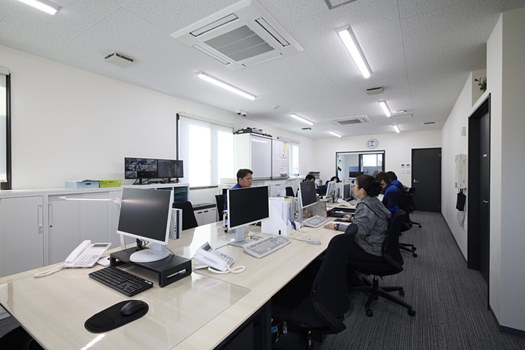 事務所では、これまで職種ごとに分散していた執務スペースを1箇所に集約いたしました。 1階には事務室と商談スペース、2階には更衣室・シャワー室・休憩スペースを配置しております。明るく開放的な環境のもと、部署や職種の垣根を超えたコミュニケーションの活性化を図り、より迅速で柔軟な顧客対応を実現してまいります。